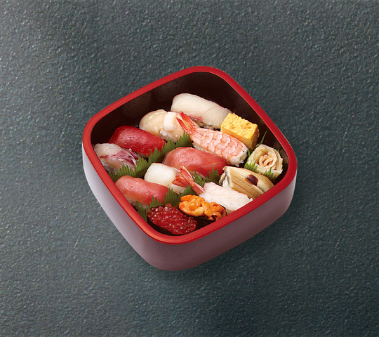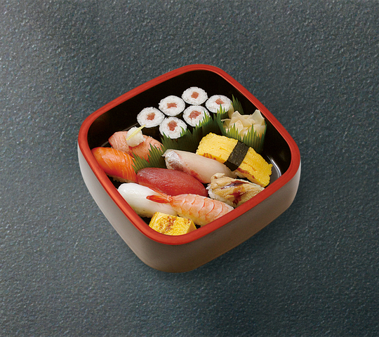 中とろ・まぐろ赤身・ほたて・サーモン・蒸し海老・生海老・カンパチ・たい・穴子・鉄火巻・かっぱ巻き・玉子・切玉子 以上12貫