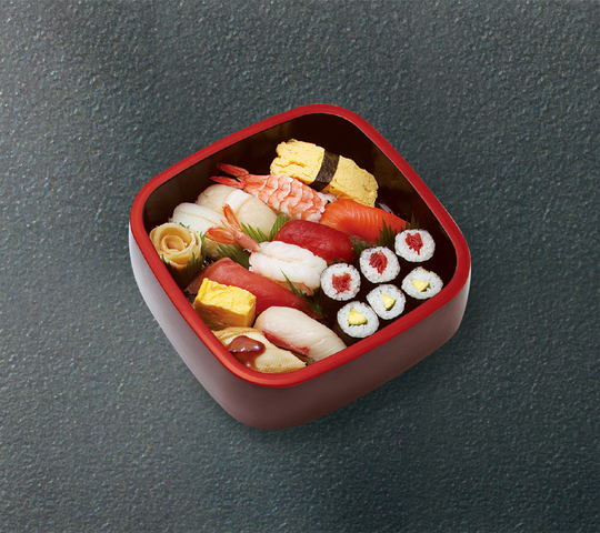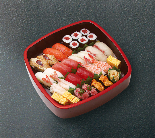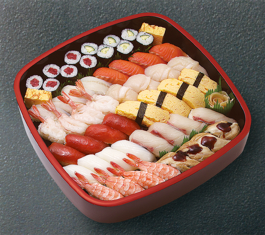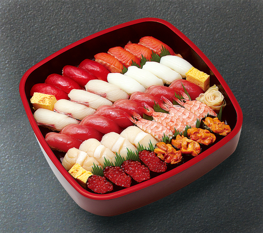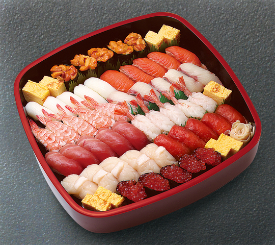 まぐろ赤身・ほたて・サーモン・蒸し海老・生海老・いか・穴子・カンパチ・玉子・たい・鉄火巻・かっぱ巻き・切玉子 以上44貫